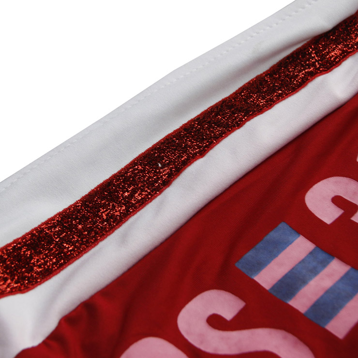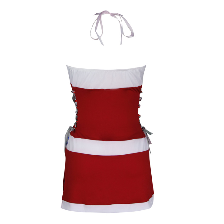 Red cheerleader mini dress made of high quality stretch knit, sexy halter neck, stripes on the bust and waist, lace-up detail on both side, side split, matching bottom shorts.