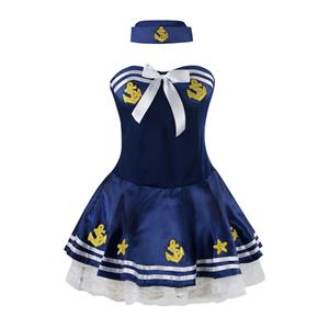 2 Piece Blue Sea Flirt Sailor Girl Costume includes Strapless Mini Dress with Satin Bow Detail, and Sailor Hat.