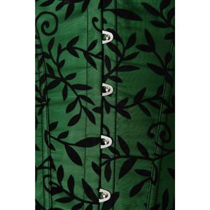 Strapless corset with black ruffled lace edging, bow embellishments, front busk closure, vine applique in black velvet, lace-up back and matching thong.