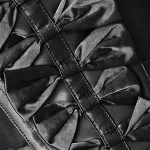 This Sexy Corset features: black satin strapless overbust corset with line up bowknots detail on the front, short pleated flare skirted detail on the hem, high quality plastic bone for support, lace-up back for cinching, matching thong.