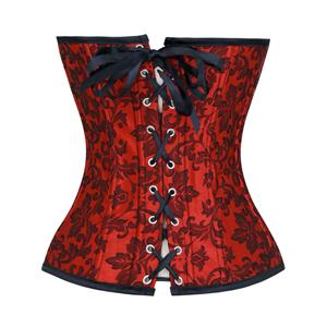 This Sexy Corset features: made of beautiful red floral brocade, black trim on the bust and hemline, plastic bone strapless corset, front busk closure for easy wearing, back lacing up for cinching, matching thong.