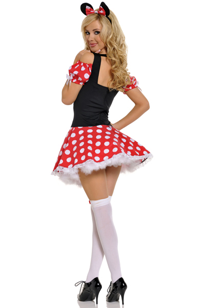 3 Piece Sexy Mouse Costume includes Strapless Polka Dot Dress, G-string, and Mouse Ears with Matching Bow.