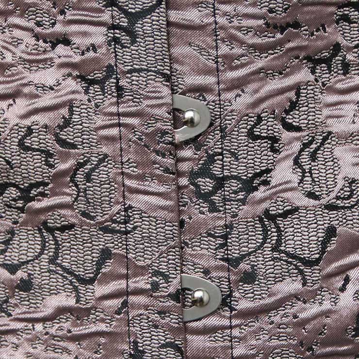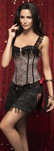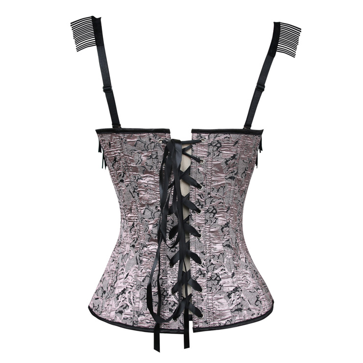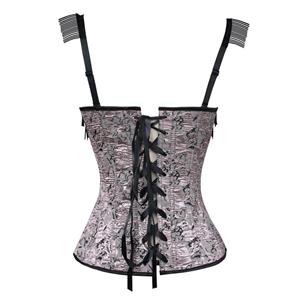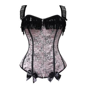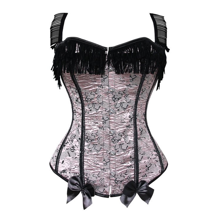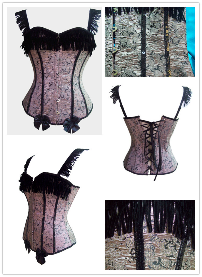 This fashion corset features include: beautiful floral brocade corset with adjustable tassels strap, black tassels details, two black bowknots decorated at the bottom, front busk closure, lace-up back.