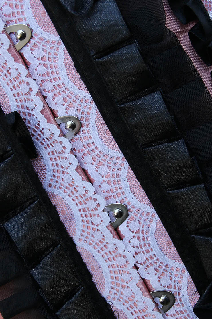Pleated Lace Trimming Corset features lace side pockets with bow-tie accent, front busk closure, lace-up back,and matching thong.
