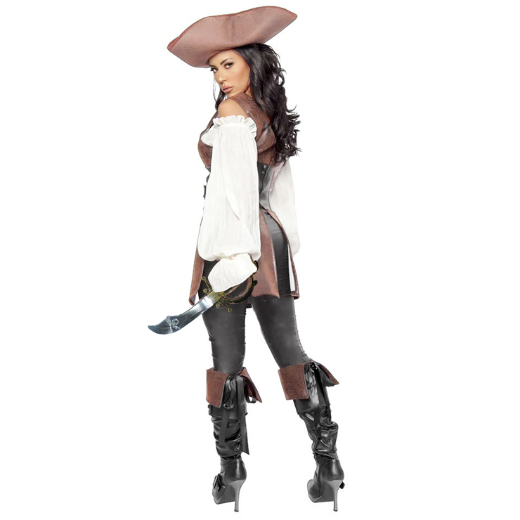 The Eight-piece, Deluxe Swashbuckler costume includes a long sleeve, off the shoulder, white gauze crop top with ruffled trim, black waist cincher with back zip closure, black studded with antique-looking belt with brass buckle, black capri pants, brown sleeveless vest, brown pirate hat, sword and boot covers.