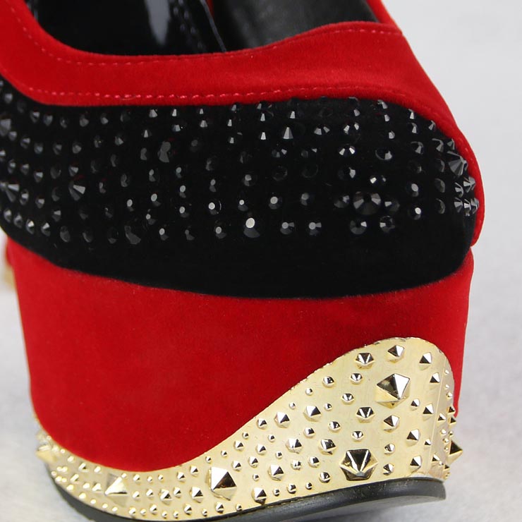 Red & Black Satin Platform Sexy High Heel Court Shoes with Rhinestones with Flower.
