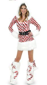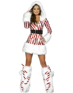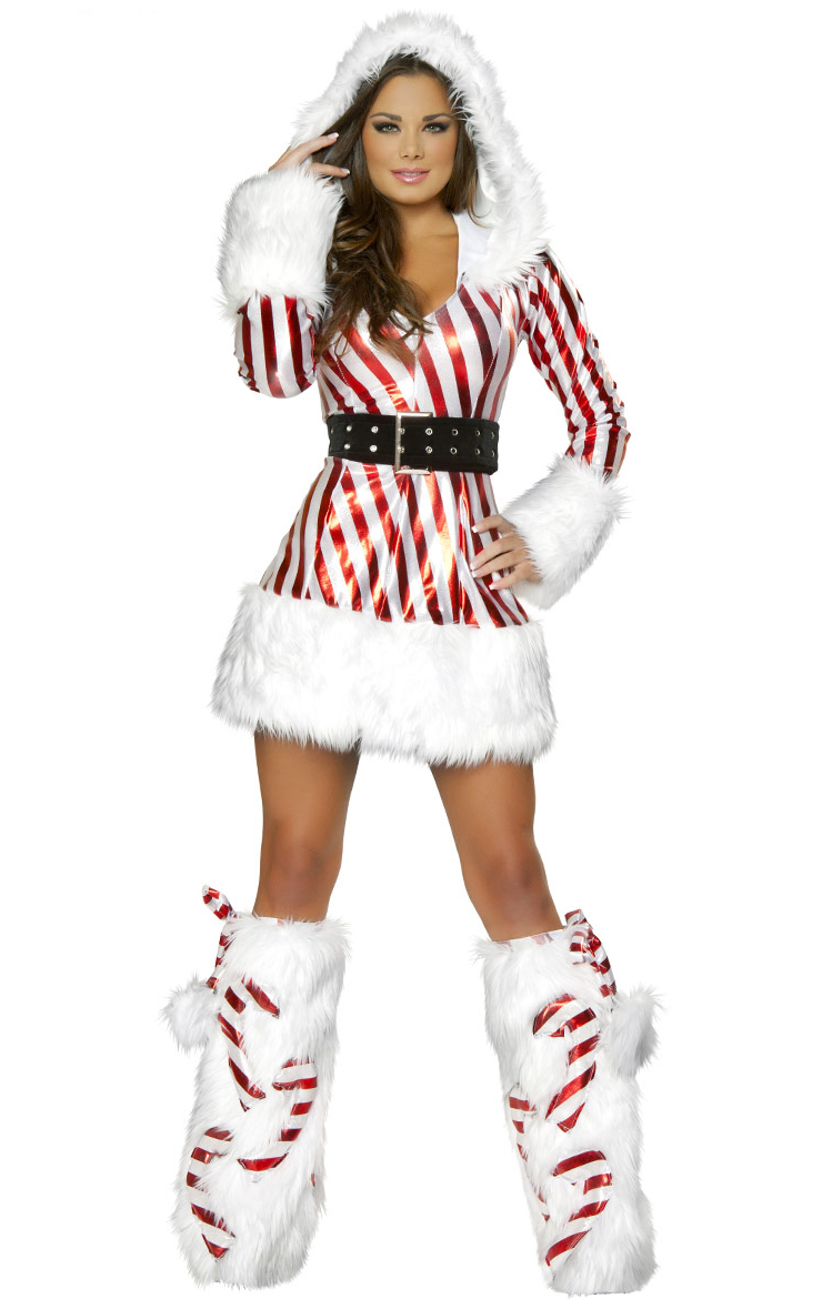 White Red Striped Candy Cane Faux Fur Lining Hooded Dress Costume Set This winter be santas little helper with this adorable candy cane dress. It features a striped print, faux fur lining, waist belt, and a zipper front. Stretch metallic, faux fur.Keep warm with these adorable holiday inspired legwarmers. This style includes a faux fur, candy cane decor, pom pom detail, and a metallic trim. Stretch metallic, faux fur.