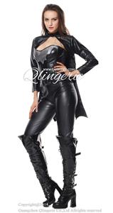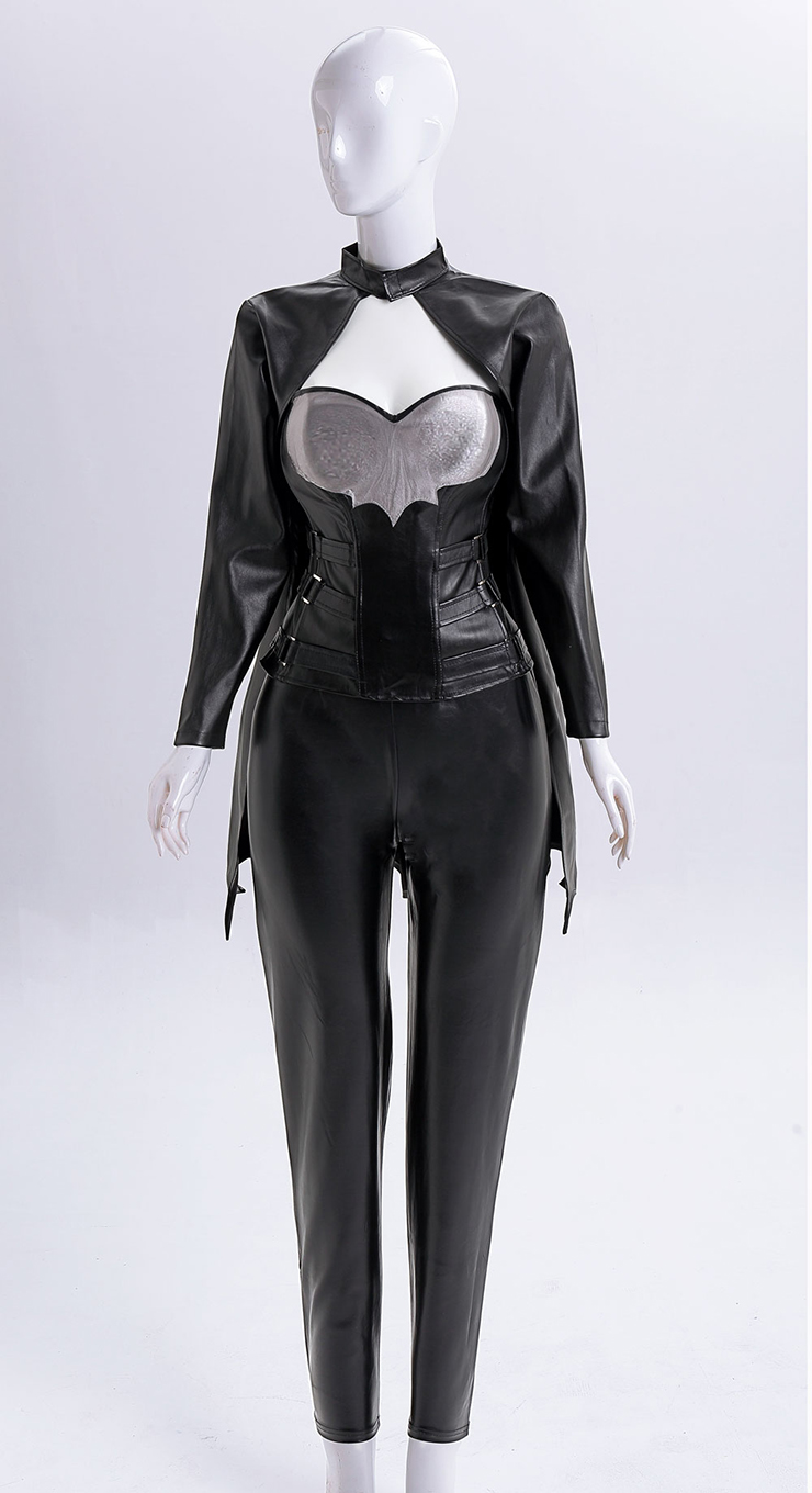 3pc The Sexy Bat costume features black fitted pants, a black, fully boned corset with buckles and bat center applique along with a cape with attached long sleeves and scalloped edges.