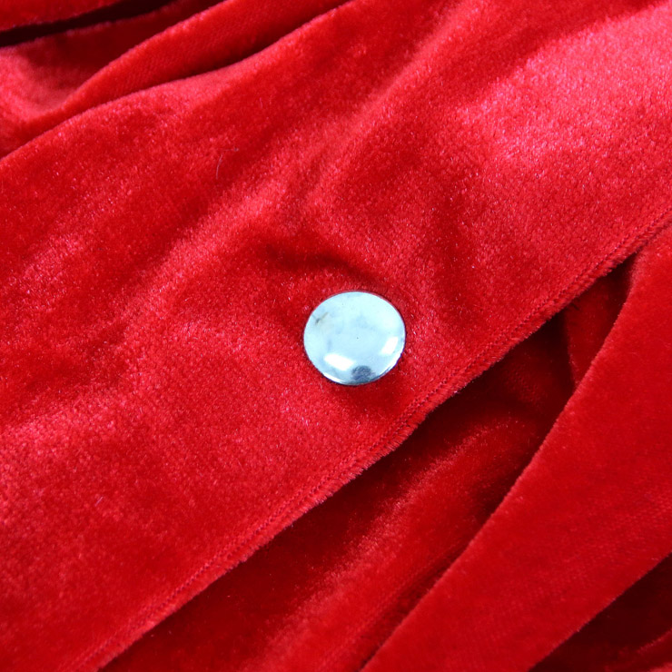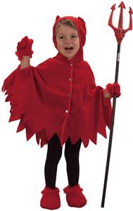 This Childs Devil Cape Costume features: Red cape with four buttons in front, serrated hem, hat with horns, matching red gloves.