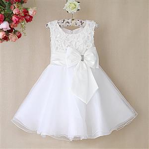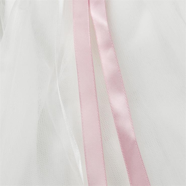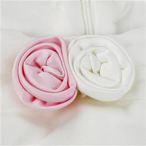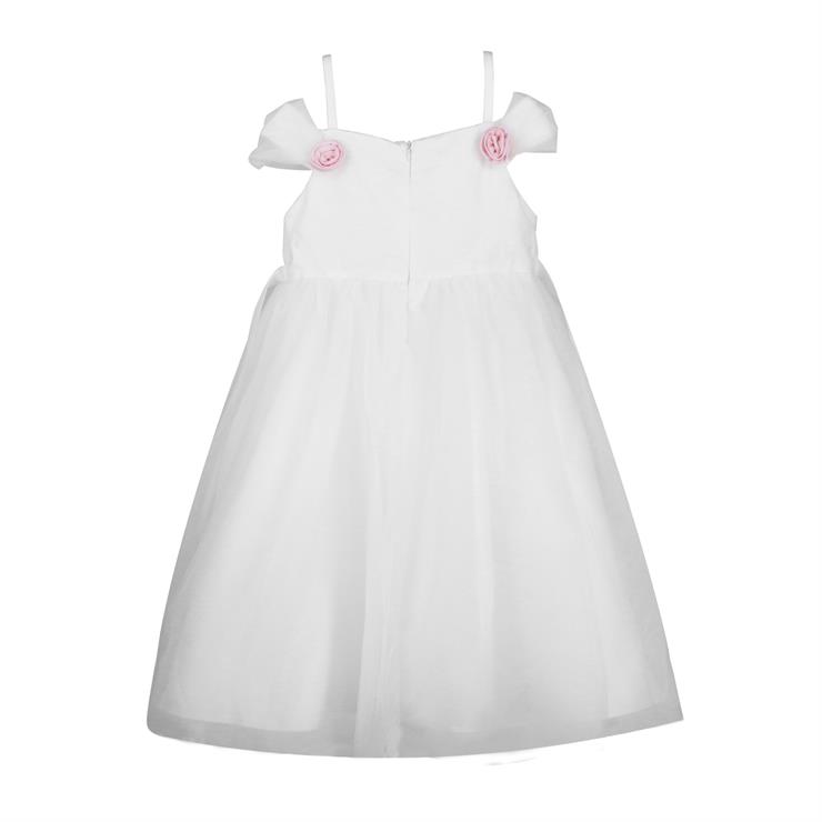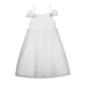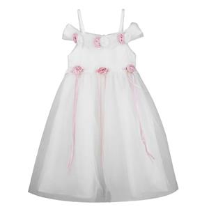 This girl's dress features include: a white mesh midi dress decoretaed with pink roses ribbon on the neckline and waist, off-shoulder disign.