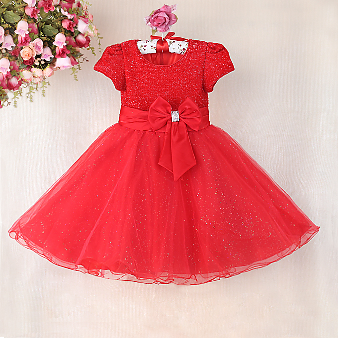 This cute red bling princess dress with big bowknot at waist, simple round neck and short sleeves, organza layer lined tulle skirt, zipper closure at the back for perfect finish.