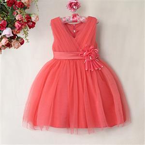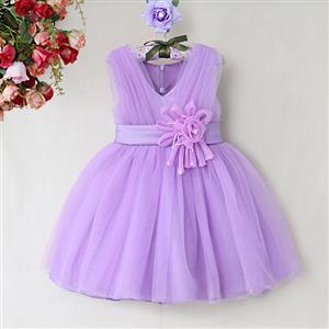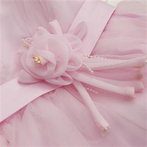 Elegant mesh satin flower pearl waist v-neck sleeveless wedding or performance show princess dress.