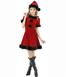 Popular so hot red christmas dress include two-pieces with high quality thick velvet fur decorate edge and two big 3d black round hair ball dress, cute black hat.