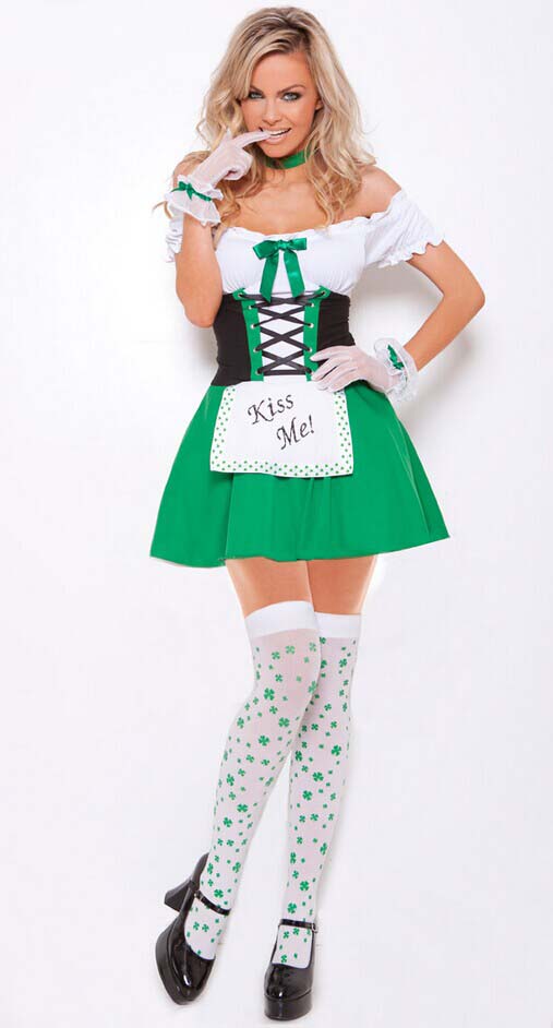 4 Pieces, sexy oktoberfest beer girl costumes include: a white cotton bateau neck green bow decoration front lace-up corset kiss me green apron costume, white gloves, green neckwear, matching g-string. (Not include stockings and black high-heeled shoes)