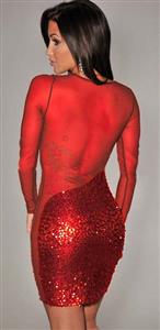 Women's sexy fashion red sequins mesh long sleeves bodycon clubwear dress.