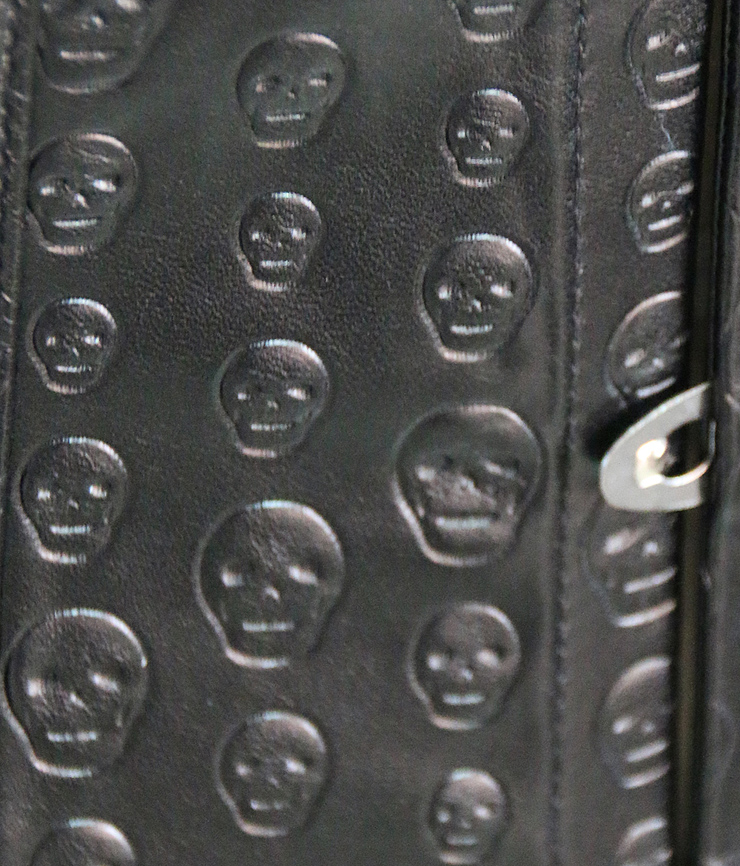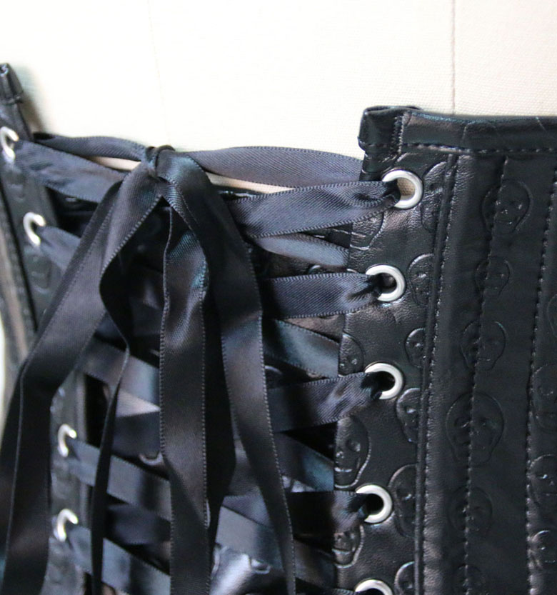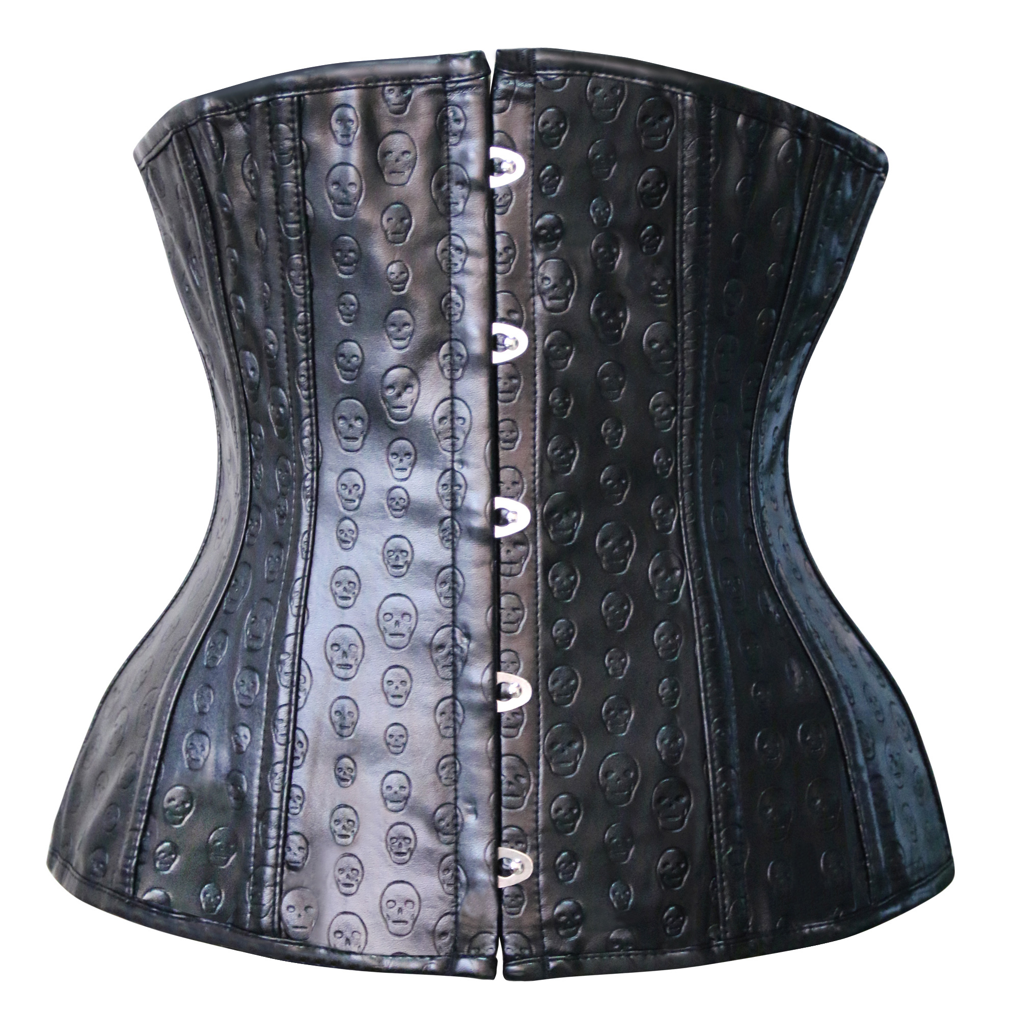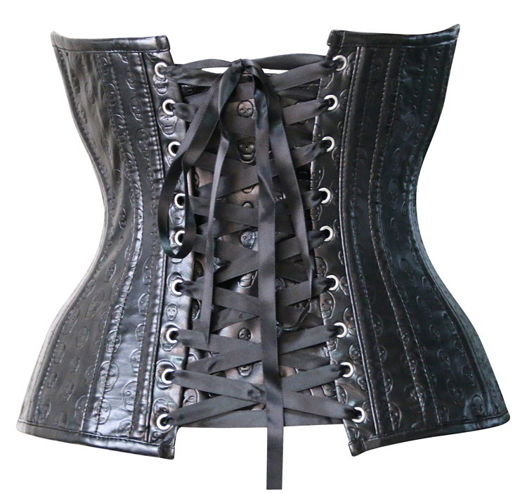 Skull print artificial leather steel boned underbust corset features stainless steel busk closure, strong corset cord lacing back.