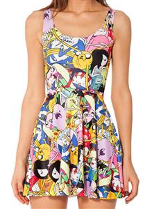 Women adventure time colorful bro ball pleated skater dress feature above knee length, graphic print with two-way wear (scoop neck and high crew neck styles) and sleeveles.