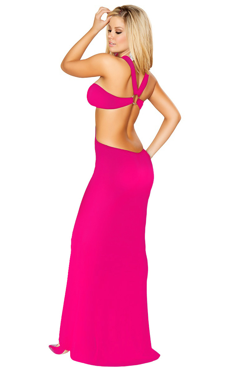 Comfortable yet sexy, this maxi gown features a bra top with an o-ring detail in the center, connecting to a side cut maxi skirt and designed with a racerback, dipping in the rear hemline for a slight tease.