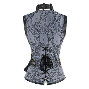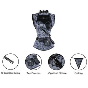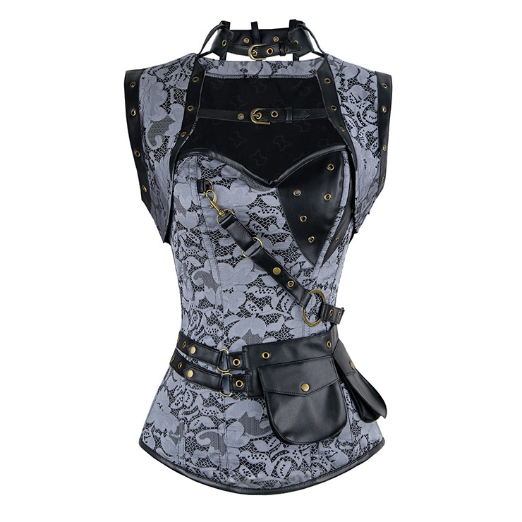 This steampunk corset features faux leather and white lace overlay accents and a removable high neck shrug, large snap up pocket attached, zipper on the side and a lace-up panel in the back.
