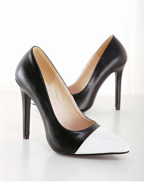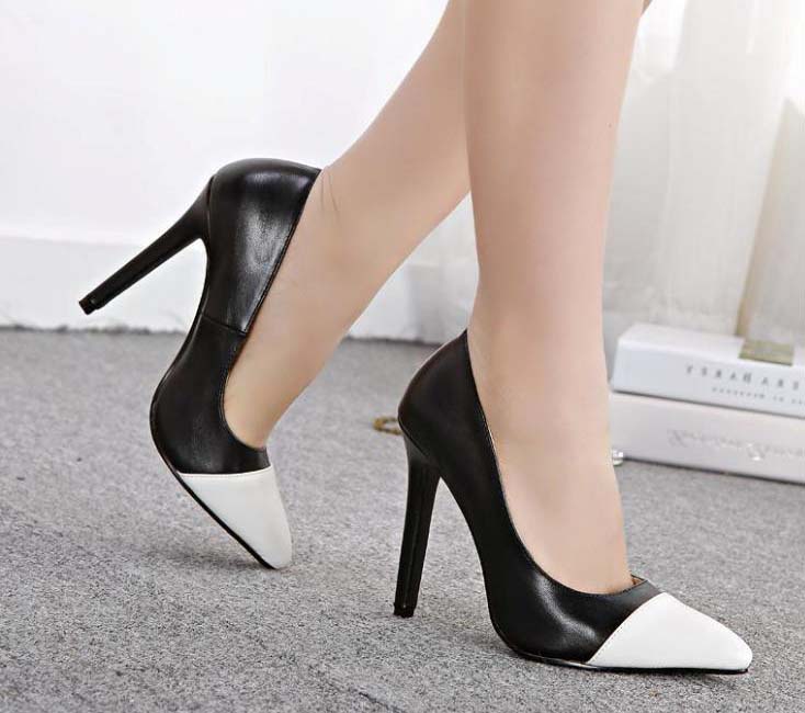 Black and white split joint cortical smooth OL pointed toe stiletto high-heeled shoes.