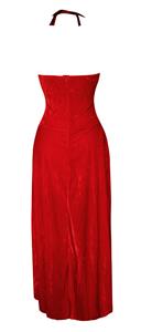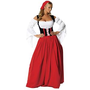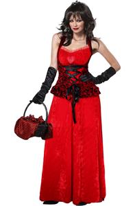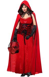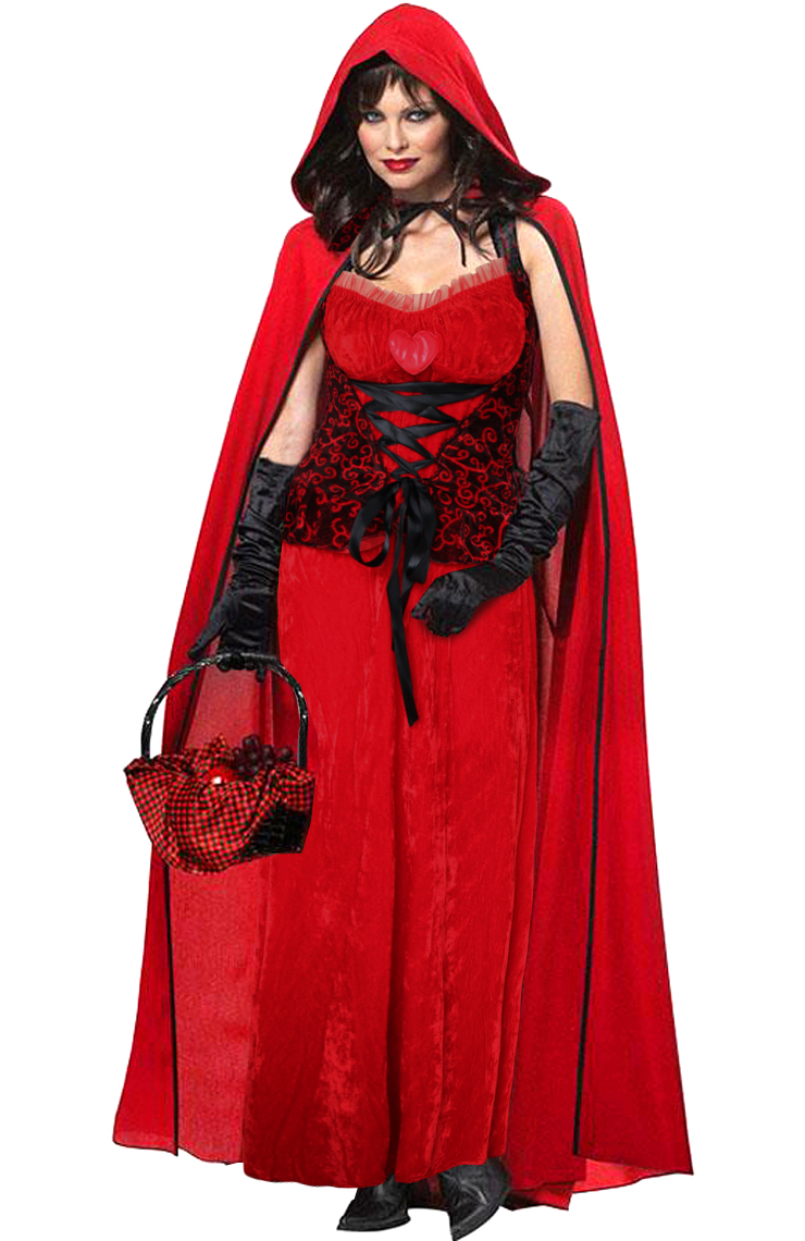 The Dark Red Riding Hood costume is a four pieces set that features floor-length pullover dress is red interlock w/ black stretch velour corset bodice is edged with satin and laced with black satin ribbon over a dark red inset panel black mesh overlay. Neckline has red organza ruffle and a small red satin rose in the middle. It also includes a long red hooded cloak is edged with black & has black ribbon ties at neck and black gloves (Basket not included.)