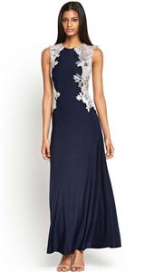 This is women's fashion elegant navy-blue ankle-length dress decorated with white floral lace applique, sleeveless, back zipper-up.