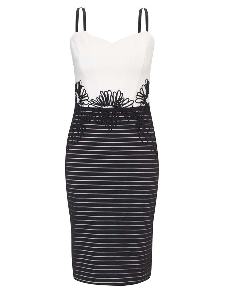 Fashion sexy black and white dress, with black spaghetti straps, black embroidery floral, knee-length stripe skirt, zip fastener in back.