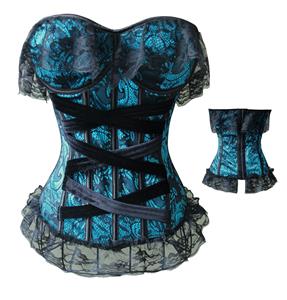 This dark-green corset look so sexy and little mysterious, with black lace trim around bust, underwire cups, front black crisscross details, lace flowers overlay the whole corset, hook and eye closure in back, g-string not included. (only include Corset)