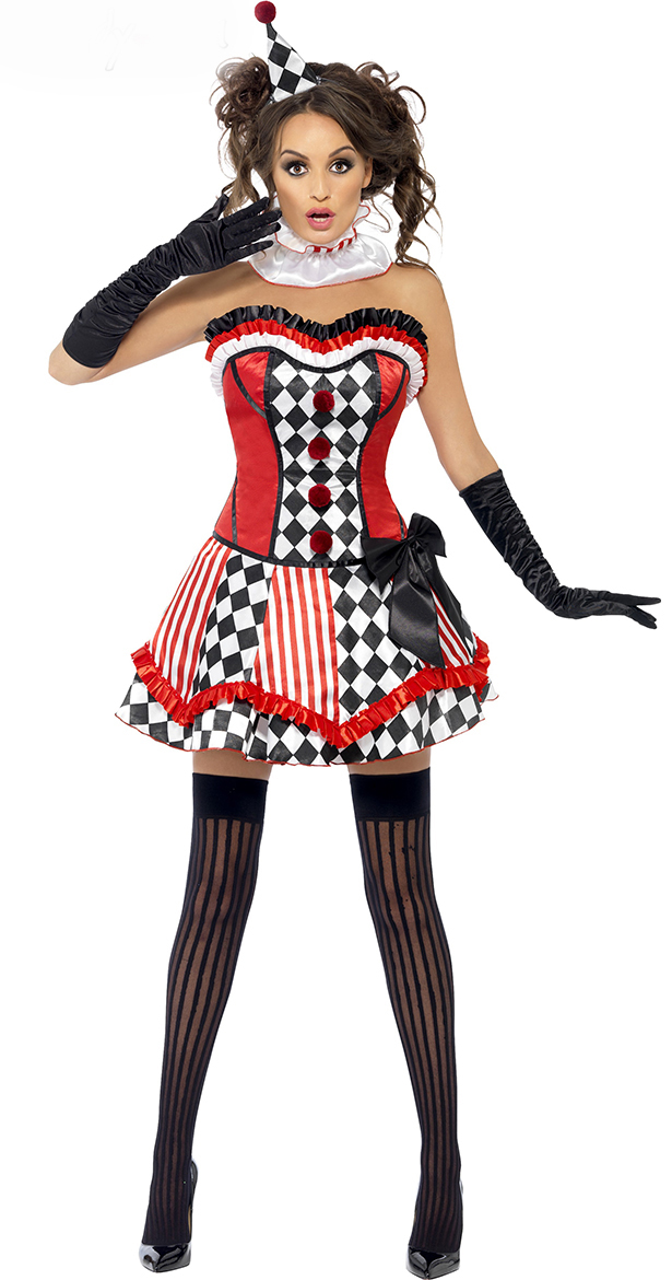 4pcs, Naughty Circus Jester Costume includes a checkered strapless corset bodice dress with a lace up back for cinching, side black big bow detailing and layered backside petticoat, matching jester's cone headpiece, a ruffled neck collar and black gloves. (Stockings not included)