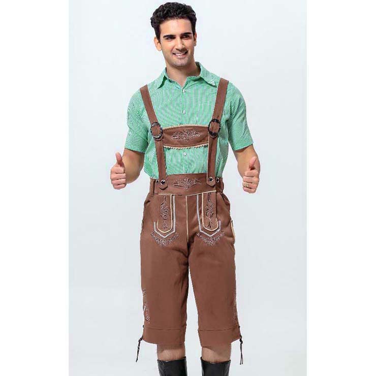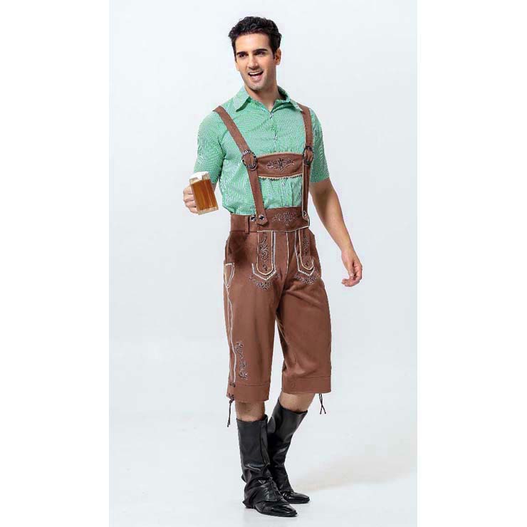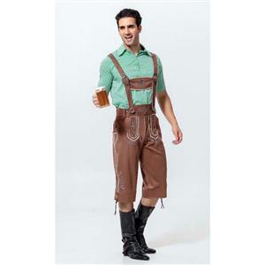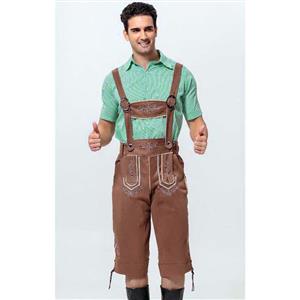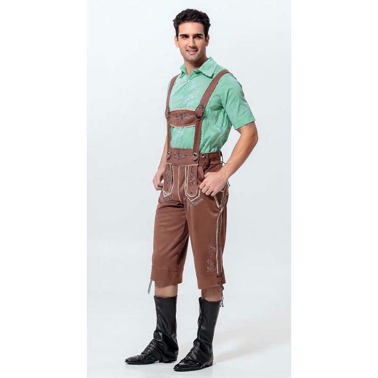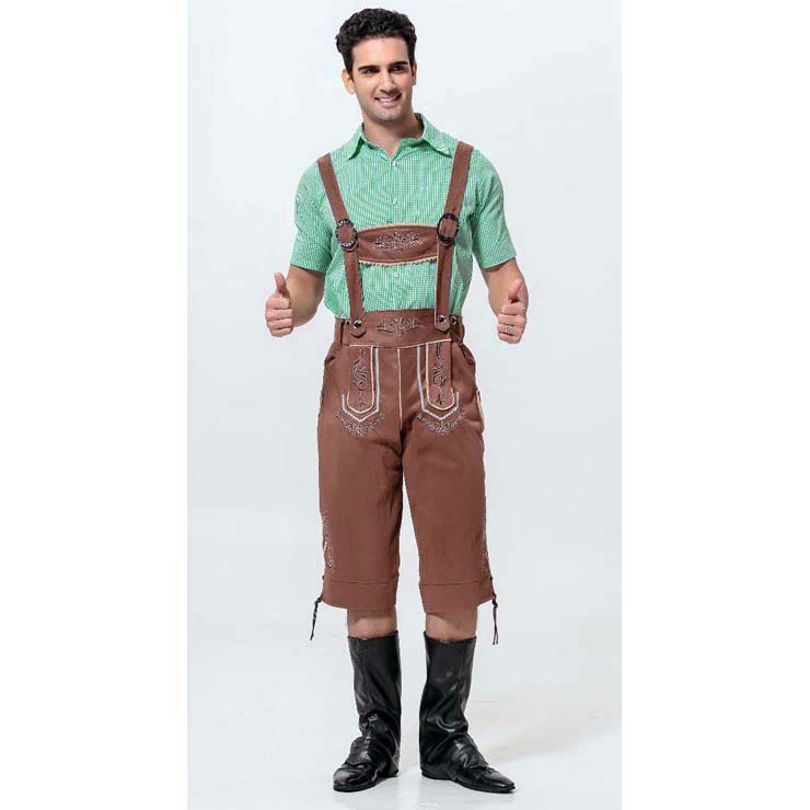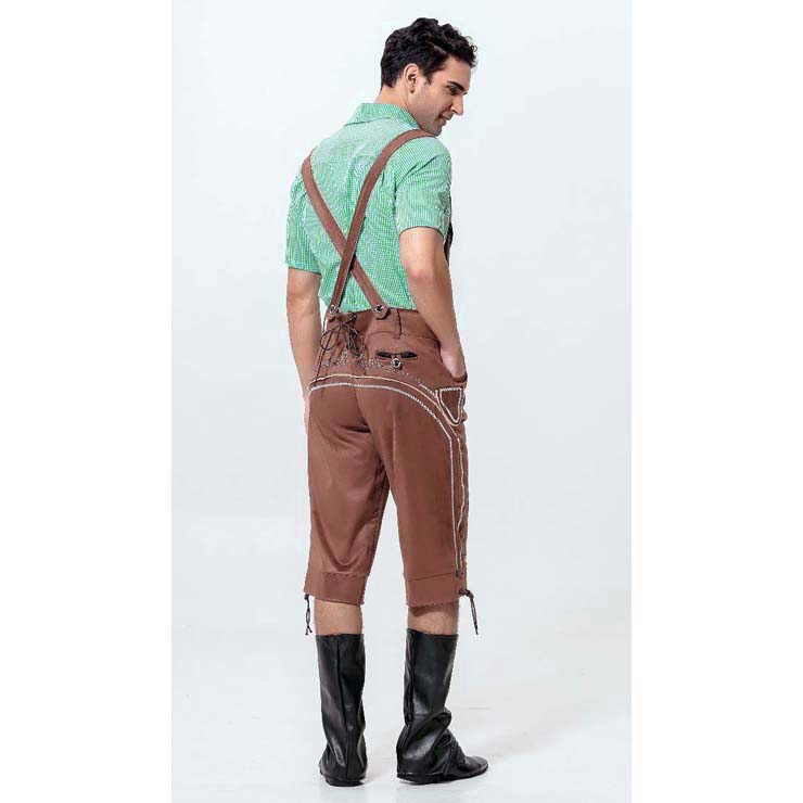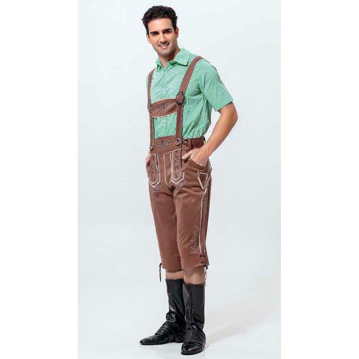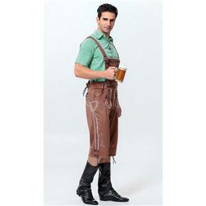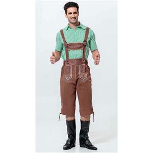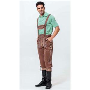 2pcs, Vintage Bavarian Oktoberfest Costume features: a brown lederhosen with embroidery pattern, and removable button suspenders with adjustable buckles, shorts with two pockets in front, one small pocket in back, back and bottom hemline with lace-up details, 3/4 length, matching a light-green short sleeves shirt. (Black feet set not included)