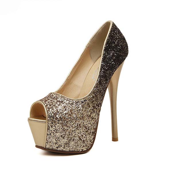 Whatever in the party, wedding or club occasion, this fashion sexy gold and black gradient shimmering powder peep toe high heels is a best choice.