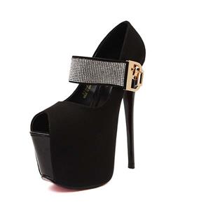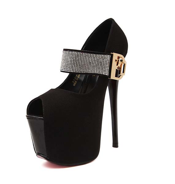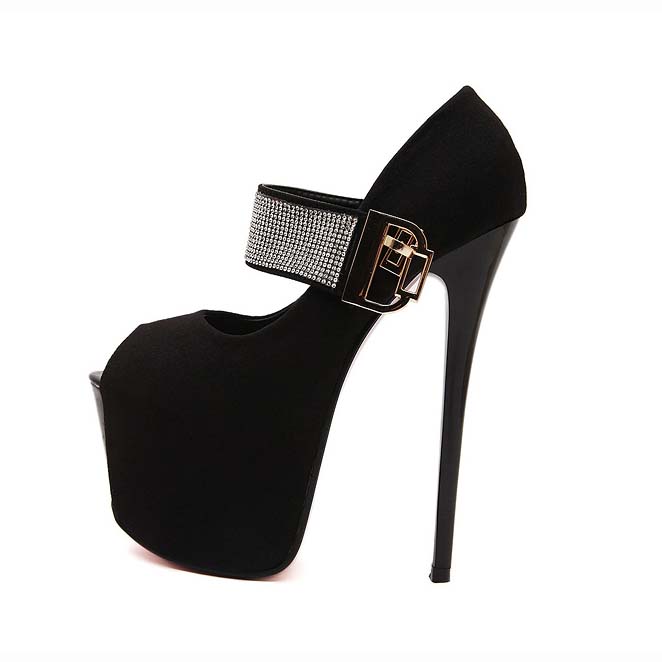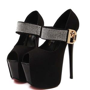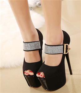 Hot sexy black with rhinestone embellish ankle wrap peep toe super high platform stiletto heels.