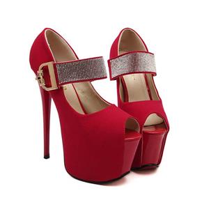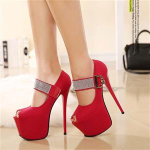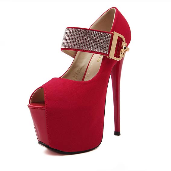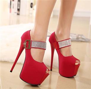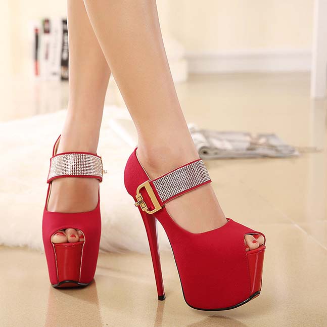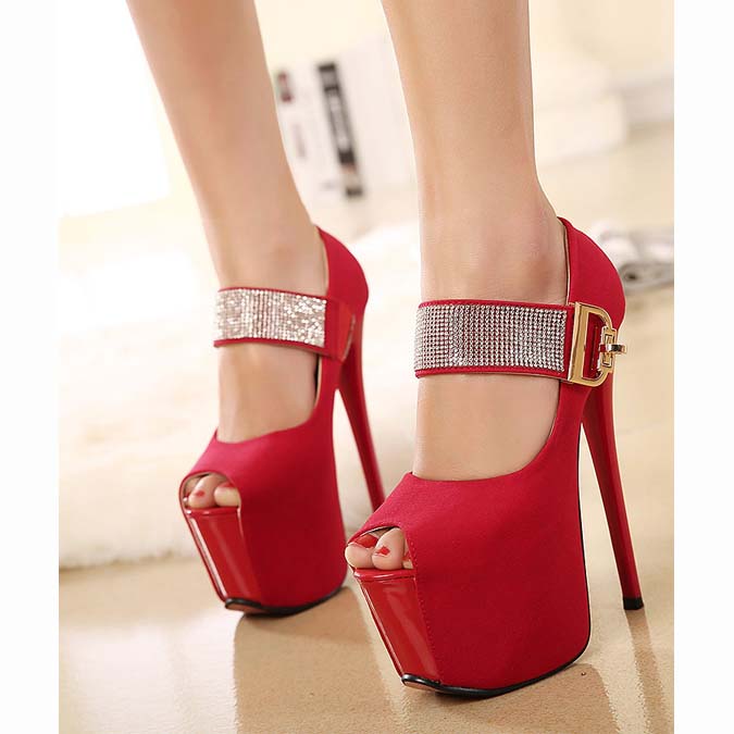 Hot sexy red with rhinestone embellish ankle wrap peep toe super high platform stiletto heels.