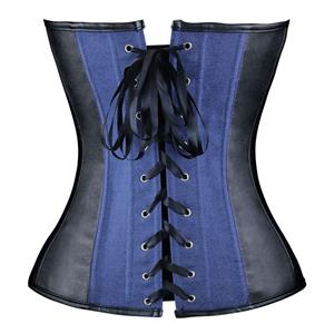 Sexy punk style boned overbust corset features: used blue denim and black faux leather material, top with two pockets details, high quality zipper closure in front, lace-up in back for cinching, g-string not include.