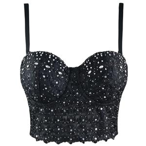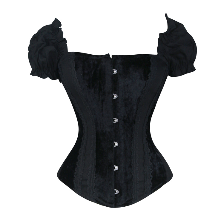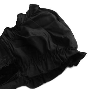 Sexy black boned bustier corset, with lovely ruffles shoulder straps, laces trim in two side, metal busk closure in front, lace-up in back for cinching, g-string not include. (only include Corset)