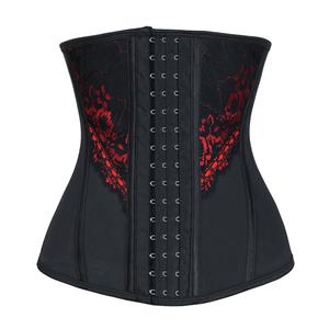 Fashion sexy black steel boned waist trainer corset, used high quality latex material, with an unique black lace floral red satin design, front three levels hook and eye closure, g-string not inlcude.