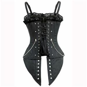 Steampunk black straps satin stripe overbust corset is a vision of Victoriana-inspired style. We all enjoy the trim of lace ruffles at the bust, and five buckles across the front of the corset for added closure, the main closure of corset is a zip fastener. Corset has added high quality chain detailing to give it a steampunk feel and front with two quirky laced panels. Matching g-string.