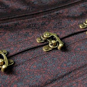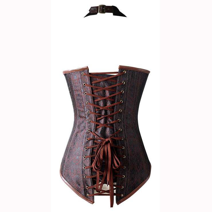 An unique brown jacquard steel boned outerwear corset, with halter turn-back collar design, four metal buck closure in front, "W" shape design in bottom, lace-up in back for cinching, matching g-string.