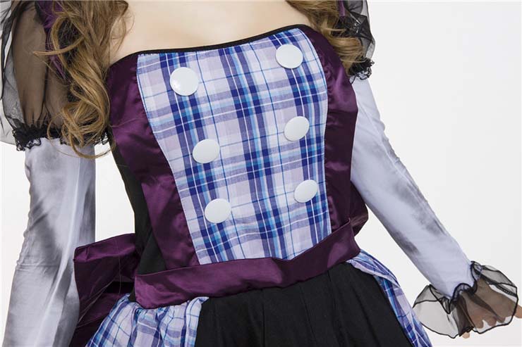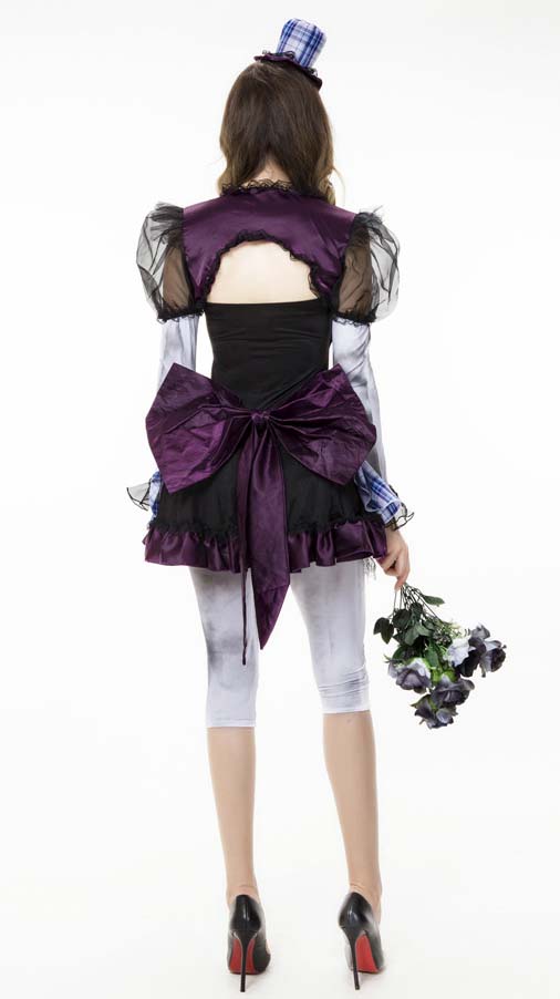 4pc, Shattered Porcelain Babe costume that features a contrasting colored dress with plaid details and a ruffle hemline, a chiffon long-sleeved shrug that fastens at the neck and has ruffled cuffs, leggings and sleeves printed in a 'cracked' fabric, a detachable backside bow, and a plaid mini top hat with lace trim. (Wig and high heels not included)