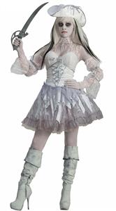 5pcs, Haunt the seas in this Dead Spirit of The Seas Costume featuring a white and gray hat with lace trim, corset bodice dress with thin padded cups and gray lace layered skirt, attached white and gray lace mini tops with lace-up neckline, matching detached white lace bell sleeves and g-string. (Wig, stockings, sword, and boots not included)
