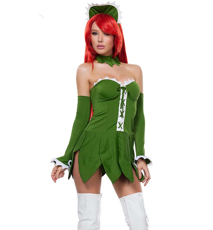 Venus Fly Trap Costume includes a green strapless corset style dress with a jagged mini skirt, scalloped trimming at the bust and on the glovelettes, faux lace up detail in front with a zip up backside, matching a choker and headband. Boots not included.