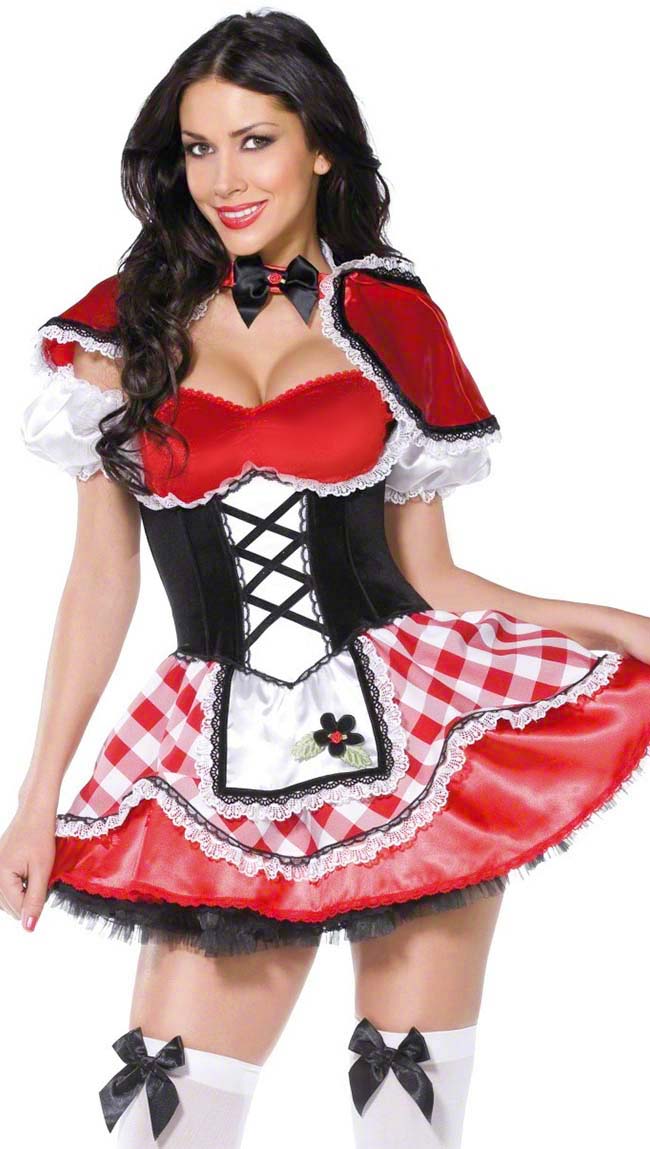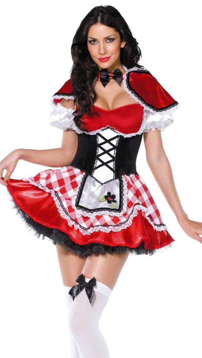 3pcs, Adult Red Riding Hood Costume includes: a sexy off-the-shoulder puff sleeves mini dress with red and white gingham print layered skirt, faux waist cincher with lace-up front, mini apron trim, matching a mini cape and g-string. (Stockings not included)