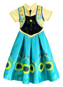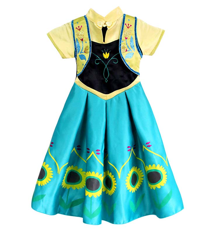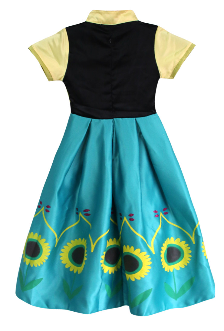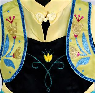 Frozen fever Anna kid costume features: a lovely little yellow cape sleeves high waist design princess dress, with pretty frog, and embroidery flower pattern in front, powdered sparkles flowers pattern trim in two side, in the bottom around with beauty satin sunflower print, two layers linings, high quality hidden zipper closure in back.