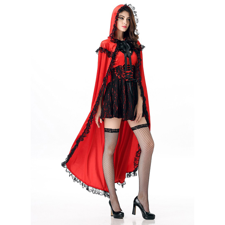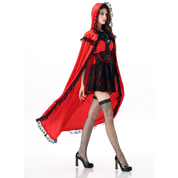 Deluxe Little Red Costume featuring corset-style top short dress with sexy deep v neckline, black ribbon lacing on corset panels, red hooded cape has ribbon lace-up, elegant black lace adding unique beauty. (Fishnet and high heels not included)
