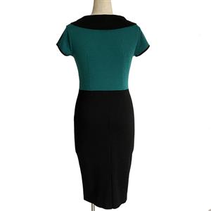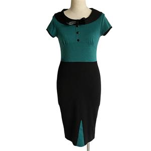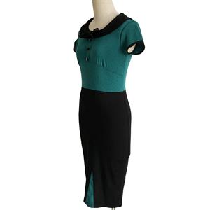 Women's vintage bodycon dress featuring conservative scoop neckline with ribbon bow, green fitted bodice with decorative buttons, flattering midi silhouette in a curve-hugging fit, fit for going to work, casual wearing or other occation.