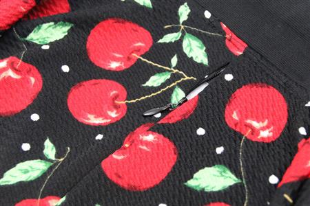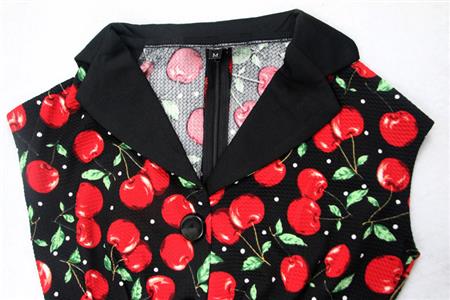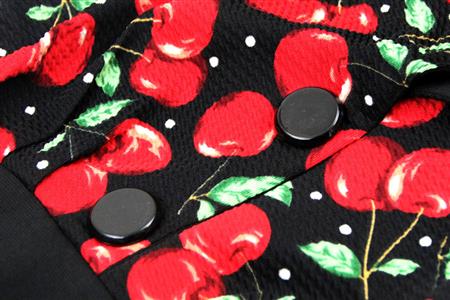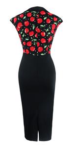Women's Vintage Pencil Dress featuring cherry printed top with v-neckline, decorative black buttons, stretchy fabric hungging your curve perfectly, concealed zipper at back for convenience.