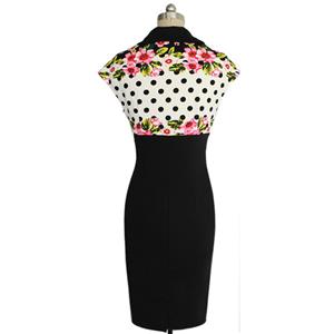 Women's Vintage Pencil Dress featuring polka dot top with beautiful floral print on shoulder and waist, v-neckline with turn-down collar, decorative black buttons, stretchy fabric hungging your curve perfectly, concealed zipper at back for convenience.