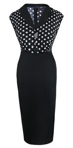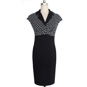 Women's Vintage Wiggle Dress featuring polka dot top with v-neckline, turn-down collar and high waist design, decorative black buttons, stretchy fabric hungging your curve perfectly, concealed zipper at back for convenience.