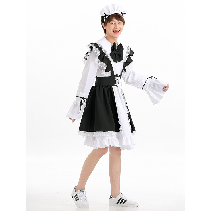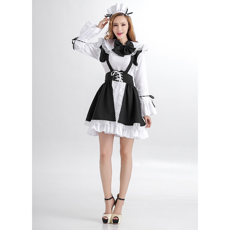Seductive French Maid Costume includes a white base dress, a black suspender skirt with white lace trim, lacing up at waist, collarband and back have a large black satin bow, matching maid head piece. (High heels not included)