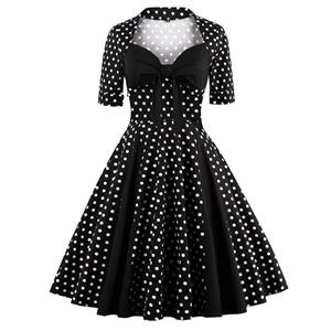 Elegant Women's 1950's Vintage Dress, fitted bodice with modest simple curved neckline and A-lined silhouette, vintage inspired polka dot pattern, a concealed zip at back for easy wearing. Complimentary matching waistbelt. Must have for social events and women’s wardrobes.